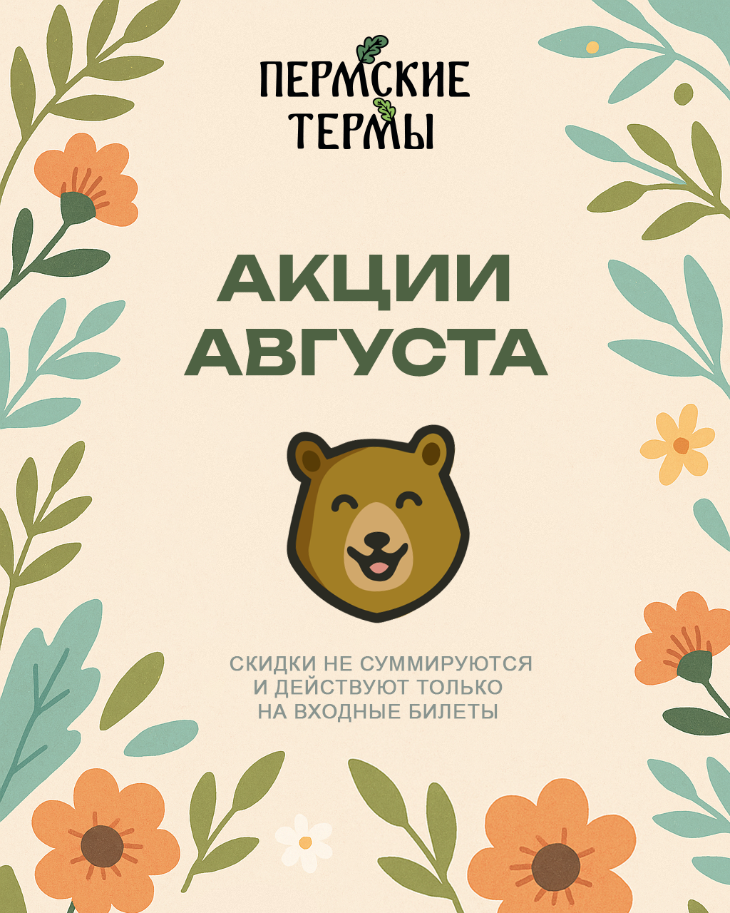 Выложи у себя ВКонтакте фото с нашими медведями, сделанное на ресепшене, с отметкой нашего сообщества Пермские Термы — получи -20% на тариф «3 часа» в любой день!